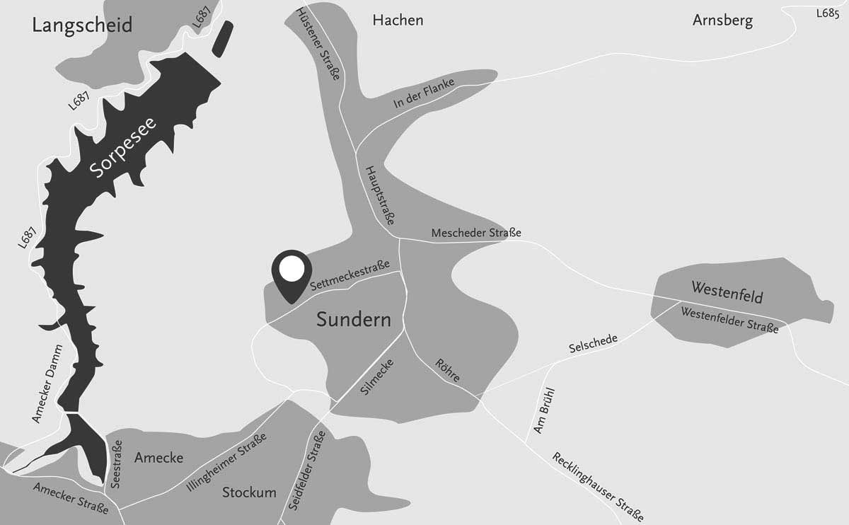 Über die A 45 bis zur Abfahrt Olpe/Biggesee, dann über Attendorn, Finnentrop und in Rönkhausen im Kreisverkehr Ausfahrt nehmen Richtung Sundern. Weiter über Sundern-Hagen und Sundern-Allendorf fahren, Richtung Sundern-Settmecke links abbiegen, nächste Kreuzung in Sundern-Amecke rechts abbiegen und nach ca. 2 km links in die Settmeckestraße einfahren. Die Hausnummer 106 a finden Sie nach ca. 1 km links (Einfahrt Strickeshagen).