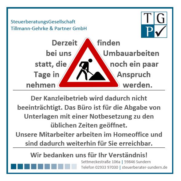 Der Kanzleibetrieb wird dadurch nicht beeinträchtigt. Das Büro ist für die Abgabe von Unterlagen zu den üblichen Zeiten geöffnet: