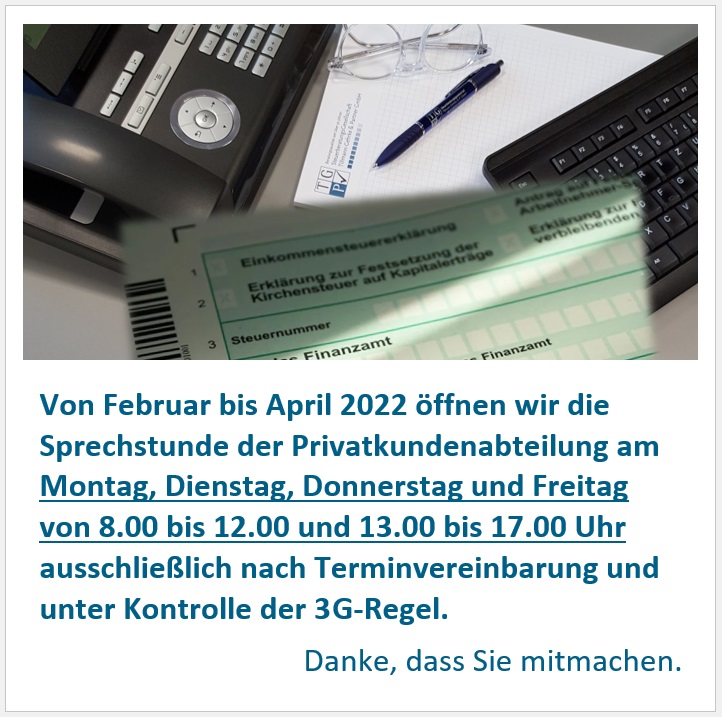 Zur Besprechung Ihrer Einkommensteuererklärung haben wir in der Privatkundenabteilung erweiterte Öffnungszeiten.